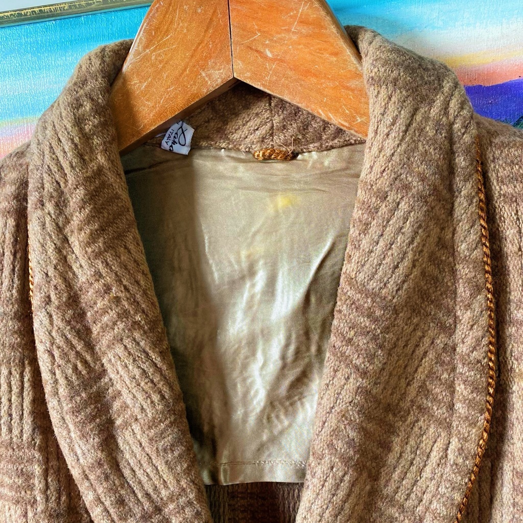 casaco alfaiataria Tweet bege, confeccionado em lã batida, possui ombreiras, modelagem oversized, bolsos externo
