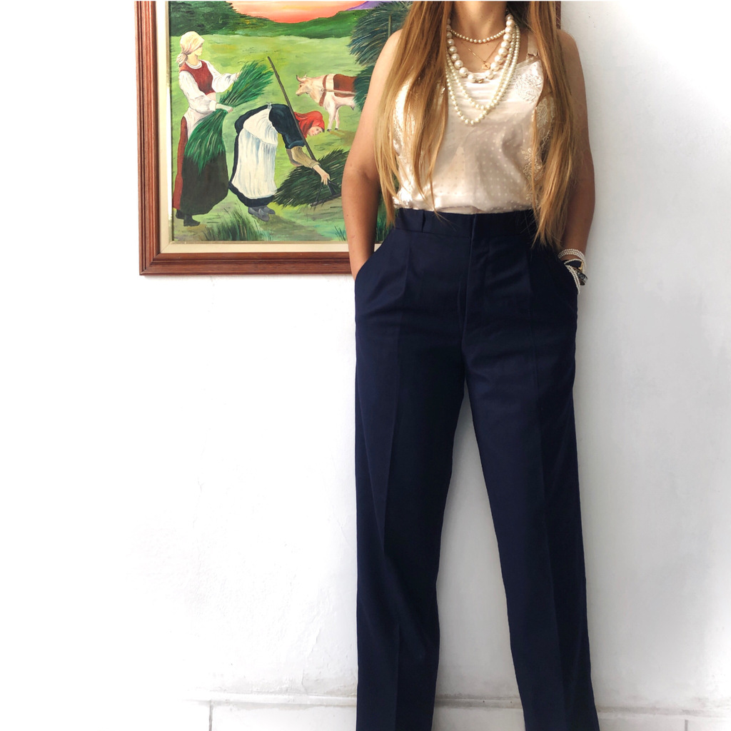 Conjunto 2 Peças Alfaiataria Azul Marinho, uma autêntica alfaiataria vintage que exala sofisticação e estilo. Este conjunto é confeccionado em 100% lã virgem, garantindo não apenas um caimento impecável, mas também um toque suave e luxuoso.