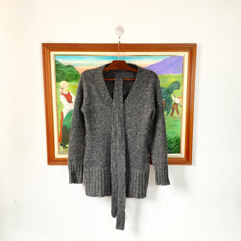 suéter cinza mescla, confeccionado em lã acrílica, possui gola v, modelagem slim, faixa opcional
